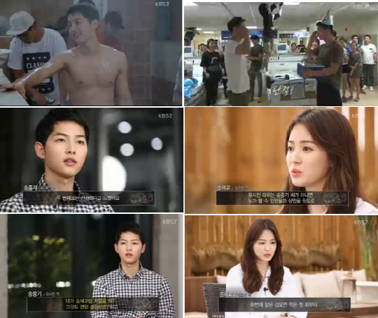 송송커플의 촬영 비하인드도 공개됐다. 촬영 리허설 장면부터 키스신 메이킹까지 시청자들의 눈길을 사로잡았다. 송중기는 여심을 강탈한 와인키스를 연습하면서 "기습 키스를 당한 송혜교가 와인병을 갖고 가는 설정을 넣자"며 "진짜 송혜교다"라고 놀리기도.