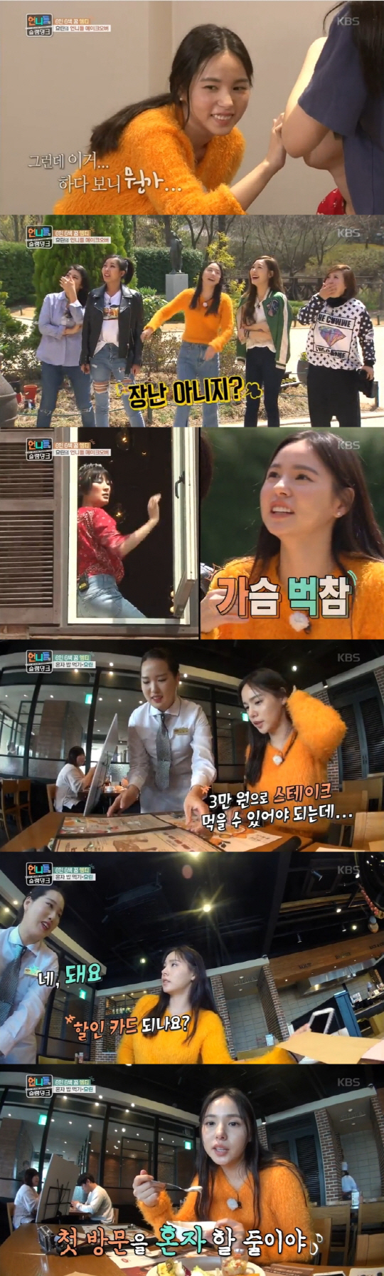민효린의 예능감은 여기서 끝나지 않았다. 김숙의 꿈인 '혼자 밥 먹기' 미션에서도 거침이 없었던 것. '혼자 밥 먹기' 최고 난이도인 패밀리 레스토랑에 들어가 샐러드바와 스테이크까지 주문한 것. 패밀리 레스토랑 직원에게 할인까지 묻는 당찬 모습을 보이기도 했다.