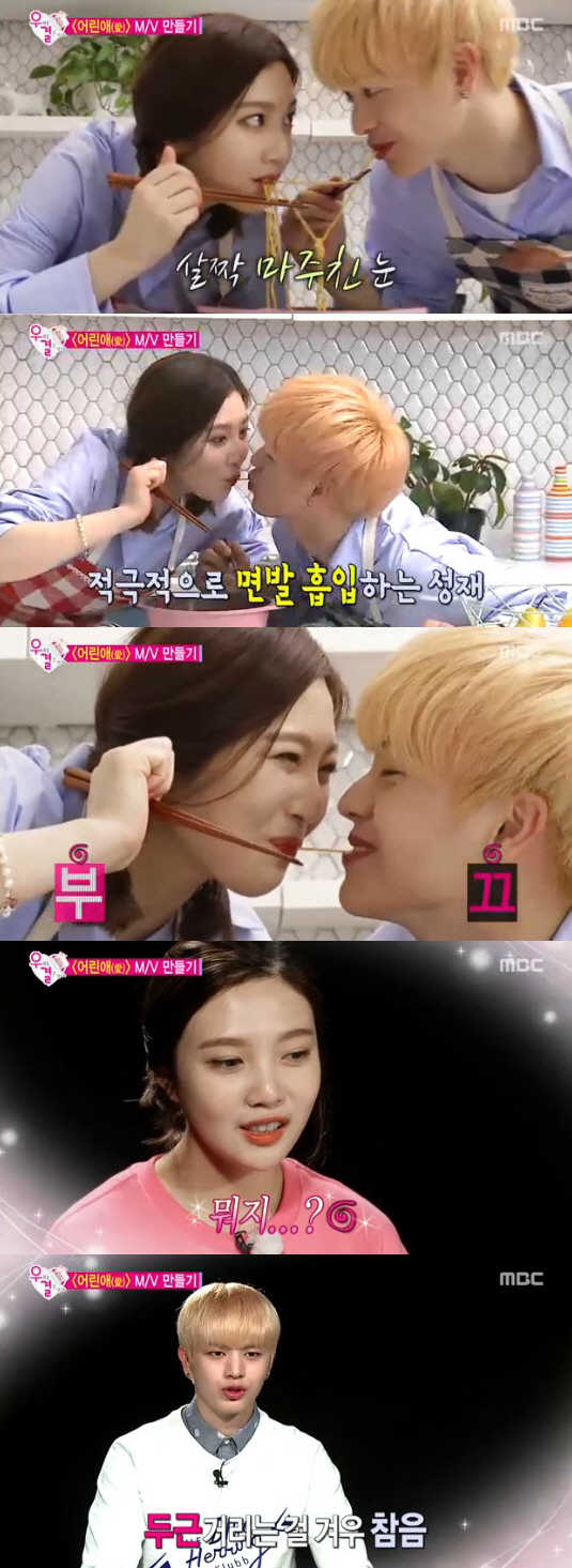[스포츠조선 조윤선 기자] '우리 결혼했어요' 육성재와 조이가 면발 키스에 부끄러워했다.