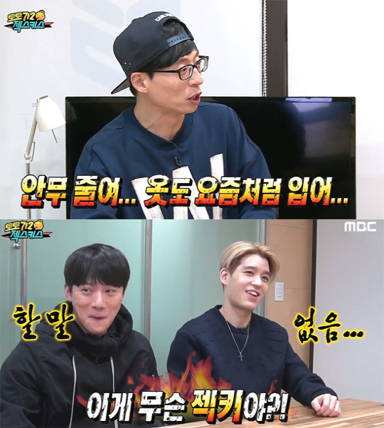 이에 유재석은 "생각을 해봐라. 그럼 안무 줄여, 옷도 요즘처럼 입어, 이게 무슨 젝키냐"고 발끈해 웃음을 자아냈다.