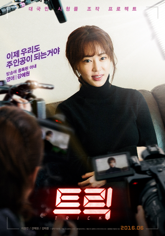 특히 영화 '날,보러와요'에서 강제로 정신병원에 감금되는 엽기적인 상황에서 진정한 공포가 무엇인지 보여줬던 강예원이 '트릭'에선 새로운 엽기적인 캐릭터를 선보여 눈길을 끈다. '트릭'에서 방송에 중독된 아내 역을 맡은 강예원은 시한부 선고를 받은 남편의 곁을 지키는 아내라고 보기 어려운 짙은 화장과 카메라를 의식하는 표정으로 호기심을 자극한다. 여기에 "이제 우리도 주인공이 되는거야"라는 카피가 더해져 강예원의 새로운 캐릭터와 연기가 기대를 갖게 한다.