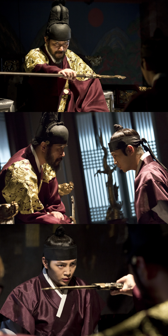 공개된 사진 속 숙종과 대길은 어두운 밤, 궁 안의 밀폐된 공간에 마주하고 있다. 자리에 앉은 숙종은 커다란 검을 들어 대길에게 건네고 있으며, 대길은 그 앞에 무릎을 꿇고 앉아 머리를 조아리고 있다. 분위기를 압도하는 숙종의 어마어마한 존재감과, 그럼에도 불구하고 눈을 번뜩이는 대길의 강단이 고스란히 느껴진다.