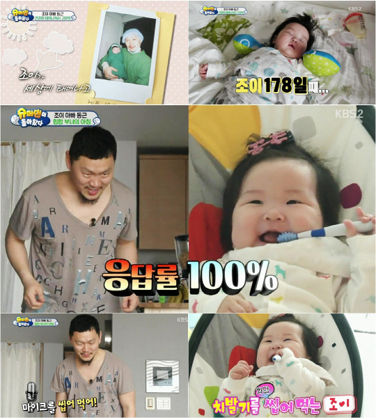 이어 양동근은 독특한 육아법으로 시선을 고정시켰다. 바로 남다른 힙합 육아법을 선보인 것. 양동근은 조이를 흔들의자에 앉혀 두곤 노래에 맞춰 조이만을 위한 단독콘서트를 펼쳐 웃음을 터트렸다. 특히 양동근은 조이의 호응을 유도하며 "SAY 호우~"를 외쳤고, 이에 조이는 화답을 하듯 "에이"라고 외쳐 시청자들을 깜짝 놀라게 했다. 더욱이 힙합 스웨그를 전파하기 위해 양동근이 딸 조이에게 "마이크를 씹어 먹어"라고 하자 조이는 바로 들고 있던 치발기를 야금야금 씹어먹으며 첫 등장부터 강렬한 힙합 스웨그를 뽐내 눈길을 사로잡았다. 이에 앞으로 두 사람이 선보일 부녀 케미에 대한 기대감을 한껏 증폭시켰다.