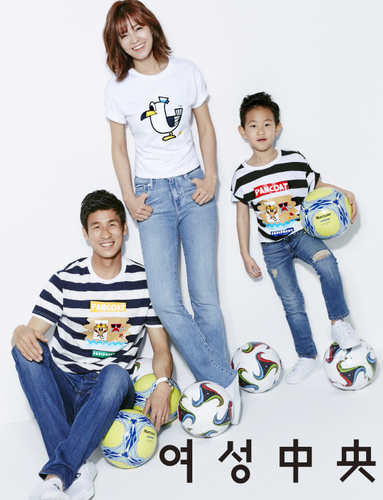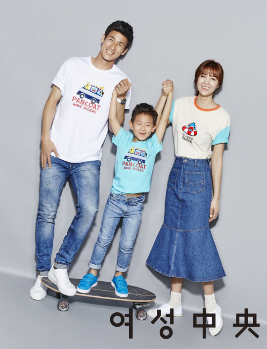 공개된 화보 속 김성은은 밝은 칼라의 데님진에 화이트 티셔츠를, 남편 정조국과 아들 정태하는 '붕어빵 부자'답게 블랙 스트라이프 티셔츠를 맞춰 입어 발랄한 패밀리 룩을 선보였다.