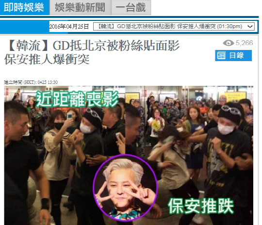 25일 홍콩 유명 종합지 애플데일리는 '지드래곤 베이징공항서 초근접 촬영 당하다 경호원이 밀쳐서 충돌'이라는 제목의 기사를 보도했다.