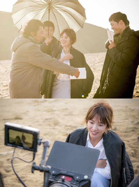 공개한 사진은 극중 죽은 줄 알았던 송중기(유시진 역)와 송혜교(강모연 역)가 1년 만에 재회하는 장면. 애틋했던 극중 분위기와 달리 환하게 웃고 있는 송혜교와 송중기의 다정한 모습이 눈길을 끈다. 또한 자신의 촬영분을 꼼꼼하게 모니터하는 송혜교의 프로페셔널한 모습도 엿보인다.