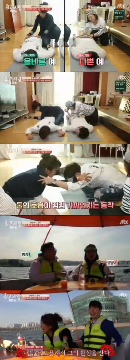 박수홍은 "내 몸을 이렇게 마음대로 한 여자는 처음"이라며 "정말 친해진 것 같다"고 말해 당황하면서도 싫지 않은 모습. 황석정은 "정말 아무 사심 없이 교육처럼 하는 것"이라며 "너무 신경쓰지 말라"고 하면서도 윤정수에게 시범을 보일때는 최대한 스킨십을 자제하는 모습으로 웃음을 유발했다.