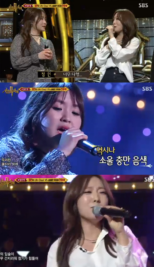 [스포츠조선 정안지 기자] '신의 목소리' 정인이 도전자가 전하영와의 대결에서 승리했다.