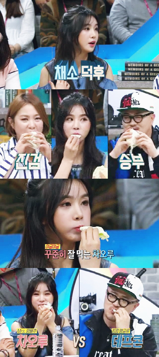 때문에 차오루의 채소 덕력을 인증하기 위해 썰지도 않은 통 양배추가 등장, 그녀는 데프콘, 박나래와 함께 난데없이 양배추 먹방 대결을 펼쳐 스튜디오를 웃음바다로 만들었다.