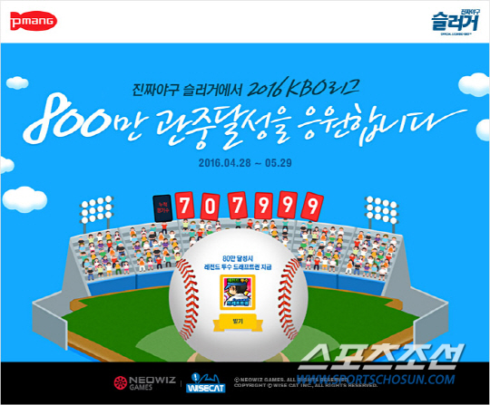 네오위즈게임즈는 온라인 야구게임 '슬러거'에서 2016년 KBO리그 800만 관중 달성을 응원하는 이벤트를 진행한다.