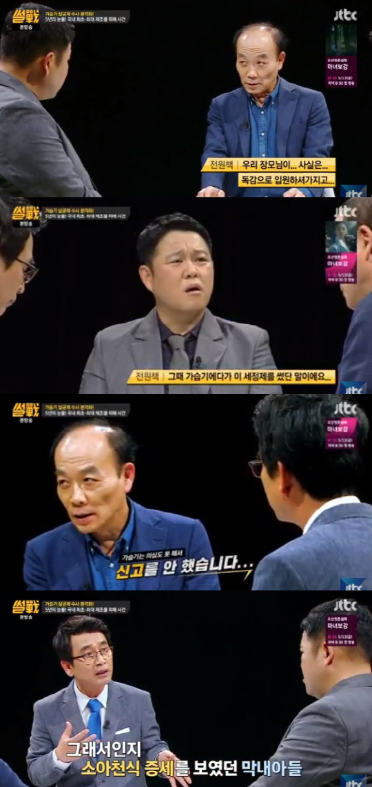 전원책은 "장모님이 독감으로 입원하셔서 급성 폐렴 판정을 받고 한 달간 중환자실에서 투병하다가 돌아가셨다. 그때 가습기에 이 세정제를 사용했다"고 털어놨다. 이어 "하지만 인과관계가 명백히 증명되는 게 아니니까 신고를 안 했다. 나 같은 경우가 많을 거다"라고 덧붙였다.