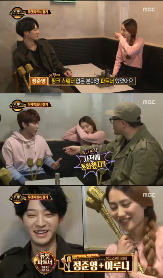 어색하게 서로 마주하자 정준영은 "핑크색 스웨터 좋아해요?"라며 달달한 멘트를 던졌다. 이어 "예전에도 핑크색 스웨터 입은 분과 파트너였다"라고 이야기했다.