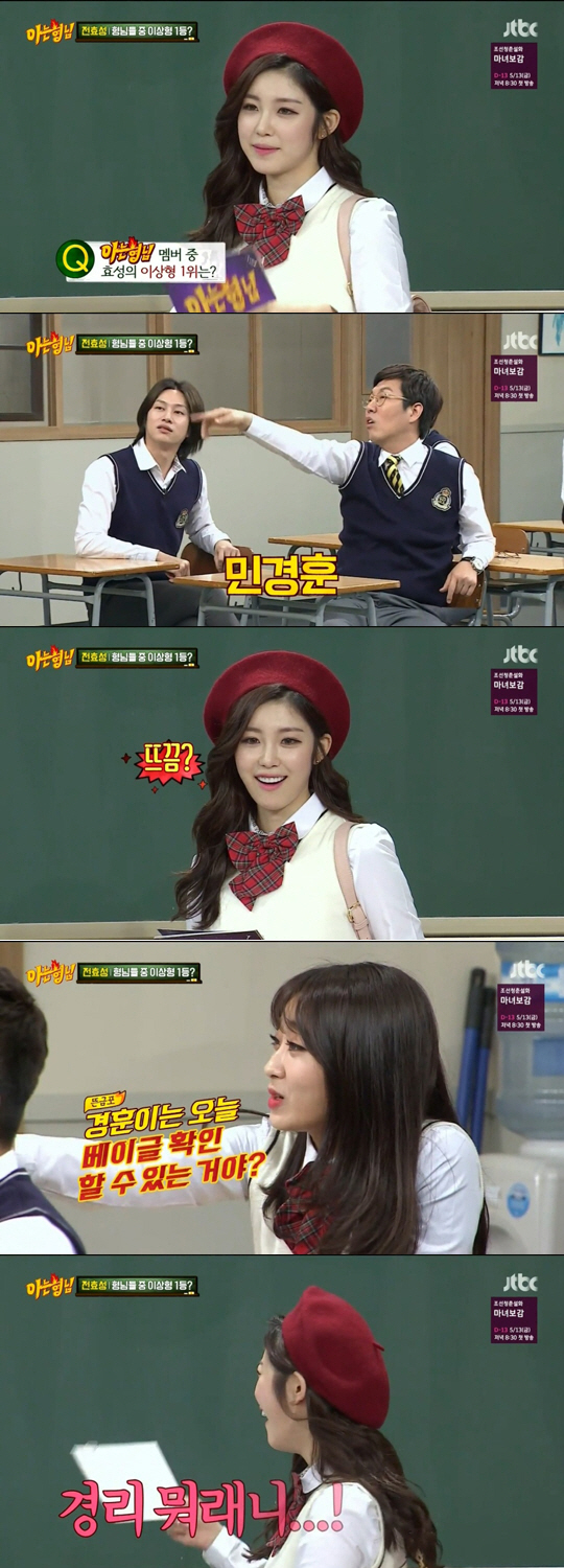 ''아는형님' 멤버중 효성의 이상형 1위는'이라는 질문에 김영철은 거침없이 민경훈을 지목했고, 전효성은 뜨끔한 표정을 지었다. 이에 민경훈은 "내 스타일도 전효성이다. 원래 강아지상을 좋아한다. 경리는 고양이상 아니냐"라고 말했다.