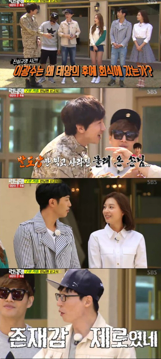 하지만 정작 진구와 김지원은 고개를 갸우뚱했다. 이들은 "이광수가 왔었나? 온줄 몰랐다"라고 답해 런닝맨 멤버들을 웃겼다. 유재석은 "이광수, 존재감 제로였네"라며 웃었다.