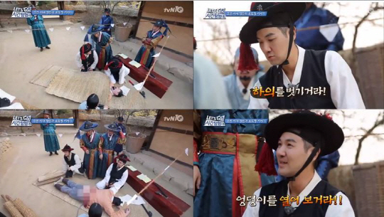 '시간탐험대3'가 단 1회만에 레전드 장면을 탄생시켰다. 조선시대의 경찰서였던 포도청의 포졸을 맡은 한상진과 김동현은 동네에서 발생한 사망사건을 조사하게 됐다. 자살했다는 증언이 있었지만, 사인을 정확히 파악하기 위해 시체의 상태를 살폈는데 '독살' 여부를 판단하기 위해 항문의 상태를 검사해야 했다고. 포도대장이 포졸 한상진을 향해 "엉덩이를 열어보거라"고 지시한 장면이 큰 웃음을 남겼다. 특히 엉덩이 강제 오픈을 당한 주인공은 이전 시즌에서 맹 활약을 펼친 개그맨 김주호였고, 그 처참한 결과는 5월 4일(수) 밤 11시 '시간탐험대3' 2화에서 공개된다.