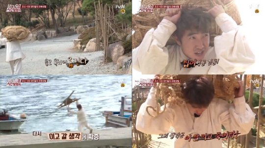 '조선시대 양반들의 유배생활' 중 군역의 의무를 진 남희석과 장동민은 군량미를 운반해야 했다. 하지만 남희석의 어깨 부상으로 장동민 혼자 군량미 옮기기에 나섰는데, 너무나 고된 군역에 장동민은 이성을 잃고 흥분하며 또 하나의 레전드 영상을 남겼다. 온갖 불평불만을 하면서도 제 몫을 다 해낸 것. 뿐만 아니라 너무 화가 난 나머지 옆에서 낚시를 하고 있던 유상무가 잡아 올린 물고기를 바다에 던져버리는 등의 돌발 행동으로 웃음 폭탄을 선사했다고.