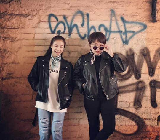 벽에 기댄 채 서 있는 두 사람은 블랙 레이더 재킷으로 걸크러쉬한 매력을 선보였다.