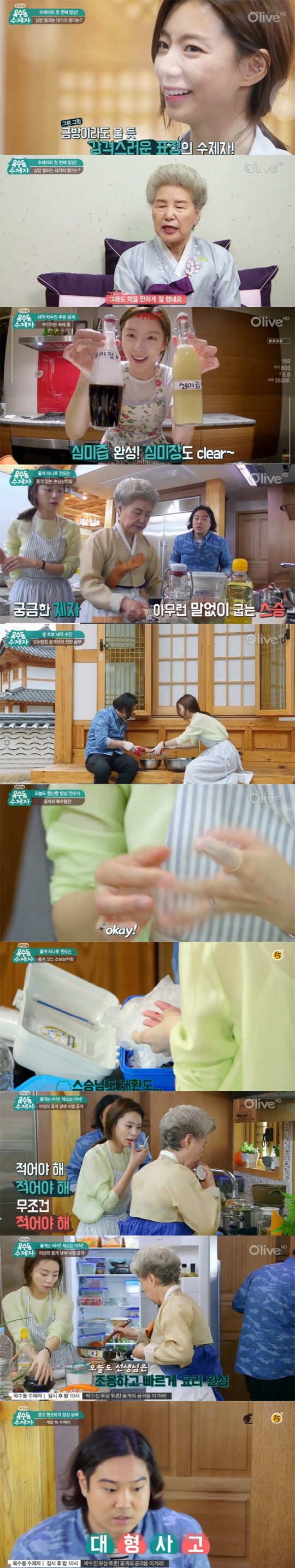 심여사는 집에서 해올 첫 과제도 내줬다. 박수진이 받은 첫 숙제는 양념의 기본인 심미즙과 심미장 마들어오기. 박수진은 집 주방에서 레시피 용량을 지켜 완벽하게 만들어 "참 쉽죠잉"이라는 귀여운 멘트와 함께 마무리, 다음날 당당히 제출했다. 하지만 불합격점. 만든 뒤 실온에 보관해서 심미즙은 상했고, 심미장은 당도 자체가 부족해 맛이 없었다. 박수진은 고생해서 만든 심미즙이 상해 집 텃밭에 비료로 뿌려지자 멘붕이 온 모습. 심미장을 맛본 심여사의 눈썹이 올라가자 자동 뒷걸음질로 보는 이의 웃음을 유발하기도 했다.