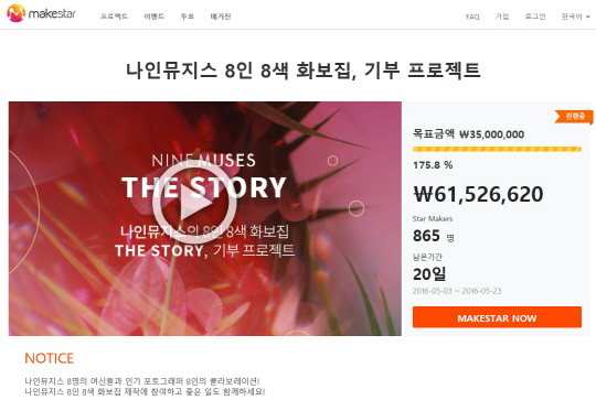 한류 크라우드펀딩 플랫폼 '메이크스타'에서 지난 3일 오후 6시에 시작된 나인뮤지스 스페셜 화보제작 프로젝트는 시작 20분만에 목표금액을 모두 채웠다.