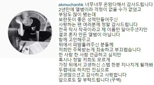 [스포츠조선 이지현 기자] 악동뮤지션 이찬혁이 자신의 인스타그램에 장문의 글을 통해 새 앨범 발표에 대한 감사의 마음을 전했다.