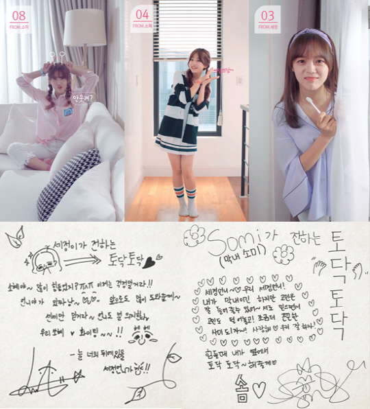 김세정은 프로듀스 101 방송을 통해 무한 성장의 아이콘으로 떠오른 김소혜에게 애정 어린 조언과 격려의 메시지를 보내며 끈끈한 팀워크를 자랑했다. 편지 상단 김세정과 똑 닮은 귀여운 캐릭터도 눈길을 끈다.