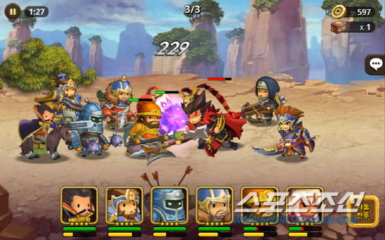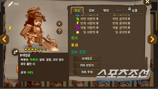 위, 촉, 오, 한 등 삼국지 영웅이 존재했던 국가를 기반으로 하는 버프를 받거나, 유비, 관우, 장비 등 삼국지 세계관을 함께 했던 영웅들의 버프도 존재한다. 전위, 딜러, 후위로 구분된 파티의 공간에 어떤 캐릭터를 세울지 등 시나리오 모드 4~5장부터는 유저들의 본격적인 고민이 시작될 가능성이 높다.