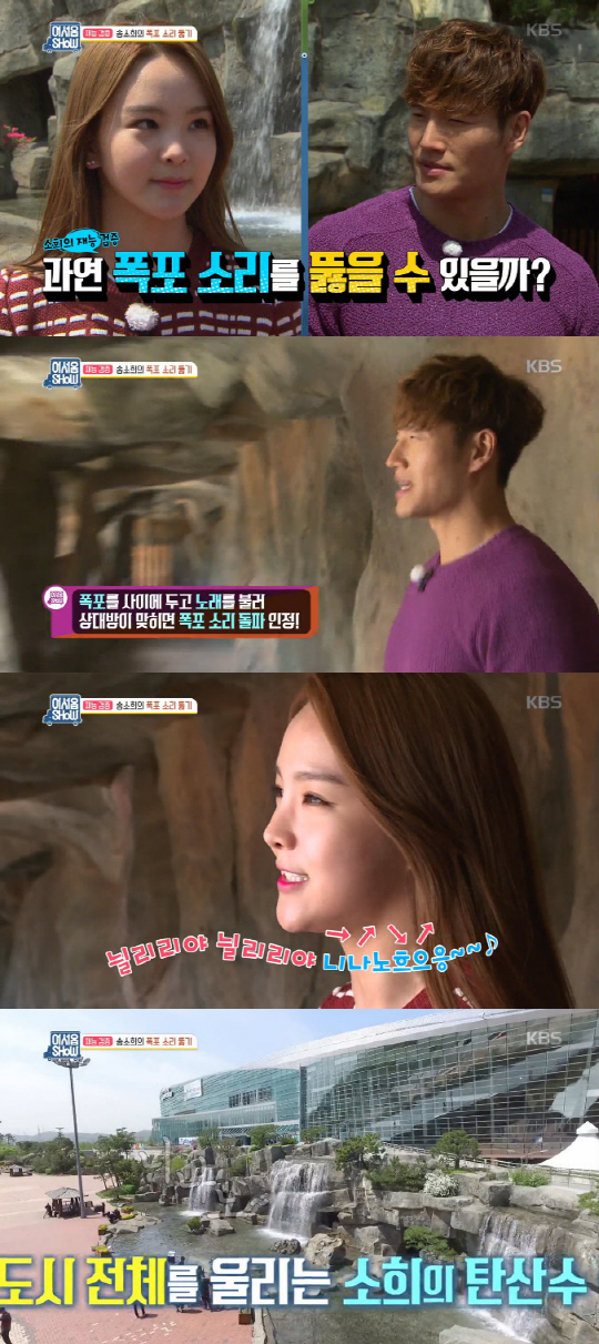 먼저 김종국이 '한 남자'를 불렀지만 폭포 소리에 묻혀 목소리가 들리지 않았다. 송소희는 "지금 (노래를)하고 계신 거죠?"라며 "뭐라고 하는지 안 들린다"고 물어 목소리로 폭포를 뚫기가 쉽지 않음을 예상했다.