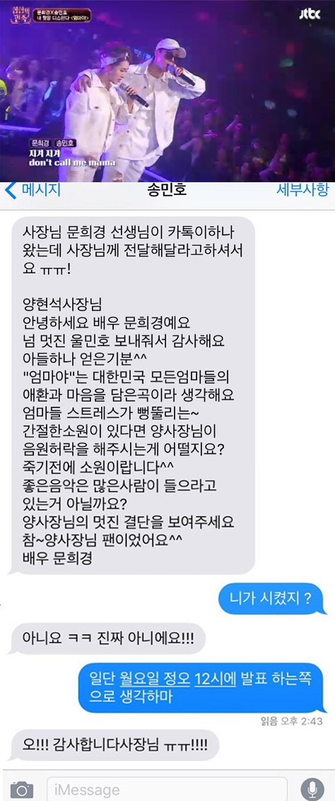 송민호는 양현석 대표에게 "사장님 문희경 선생님에게 카톡이 왔는데 사장님께 전달해달라고 하셔서요. '양현석 사장님. 안녕하세요. 배우 문희경이에요. 너무 멋진 우리 민호 보내줘서 감사해요. 아들 하나 얻은 기분. '엄마야'는 대한민국 모든 엄마들의 애환과 마음을 담은 곡이라 생각해요. 엄마들 스트레스가 뻥 뚫리는, 간절한 소원이 있다면 양사장님이 음원 허락을 해주시는 게 어떨지요? 죽기 전에 소원이랍니다. 좋은 음악은 많은 사람이 들으라고 있는 거 아닐까요? 양사장님의 멋진 결단을 보여주세요. 참 양사장님 팬이었어요. 배우 문희경'"이라는 글을 전했다.