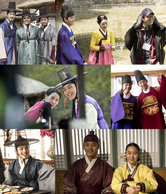 극 중 연잉군의 호위무사인 상길 역의 승재, 이인좌의 곁을 지키는 무사 무명 역의 지일주, 연잉군의 어머니인 숙빈 최씨 역의 윤진서, 세자 역의 현우, 담서 역의 임지연 등. 사진 속에서 이들은 모두 여진구와 함께 촬영 중 카메라를 향해 환하게 미소 짓고 있다. 함께 브이자를 그리는가 하면 즐거운 대화를 주고 받은 듯 함박웃음을 지어 보인 것. '대박'의 연출을 맡은 남건 감독의 웃음 역시 빼놓을 수 없다.