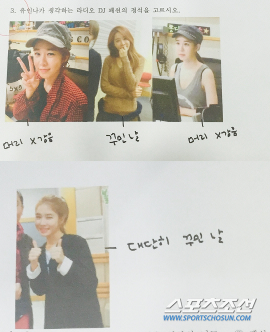 3번 문항은 꿀디의 라디오 패션에 관한 문제였습니다. 꿀디는 아주 상세하게도 모든 보기에 설명을 덧붙여 줬어요. 아주 깜찍한 글씨체로 말이죠. 1번은 머리 안감은날, 2번은 꾸민날, 3번은 또 머리 안감은 날, 4번은 대단히 꾸민날이라고 적었어요. "밤에 라디오가 끝나고 반신욕을 즐기는데, 머리를 밤에 감고 자니 다음날 또 감기가 아깝더라구요. 그래서 특별한 스케줄이 없으면 어제 감았는데 뭘~ 하고 그냥 가려 해요. 근데 더럽지는 않지만 모양새가 좀 그래서 모자를 써요. 근데 또 깊이 눌러쓰면 답답하니 그냥 얹어 놓아요. 이장님처럼요."