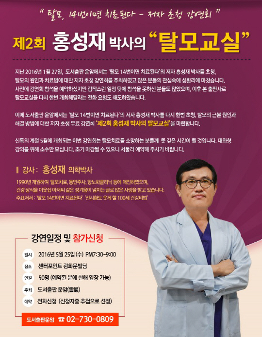 도서출판 운암이 오는 25일 서울 종로 센터포인트광화문타워에서 탈모치료 권위자인 홍성재 박사를 초청해 무료 강연회를 연다. 오후 7시 30분부터 9시까지, 참여 인원은 50명이다.