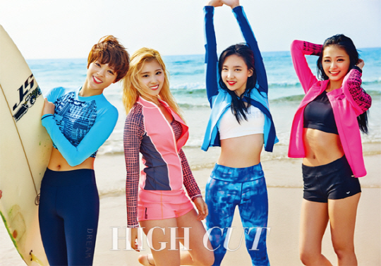 트와이스는 5일 발간된 스타 스타일 매거진 '하이컷'을 통해 제주도의 아름다운 해변을 배경으로 아레나의 다채로운 래시가드 룩을 선보였다. 트와이스 특유의 발랄한 매력이 돋보이는 콘셉트였다. 9명 멤버들의 탄력 있고 건강한 몸매도 눈길을 끌었다. 특히 크롭트 형태의 래시가드를 소화한 쯔위의 단독 컷은 보정이 필요 없는 완벽한 보디라인으로 시선을 사로잡는다. 이번 화보에서 트와이스는 아레나의 2016 S/S 시즌 신제품 래시가드를 착용했다.