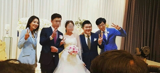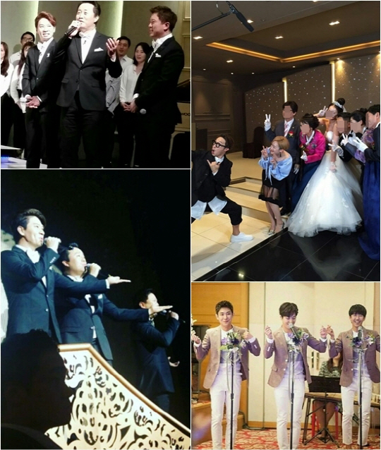 사진에는 결혼식장에서 축가를 열창하고 있는 멤버들과 게스트들의 모습, 또 신랑 신부와 유쾌한 인증샷을 남기고 있는 이들의 모습 등이 담겼다. 특히 '불참의 아이콘'으로 인기를 얻고 있는 조세호가 등장해 눈길을 끌기도 했다.