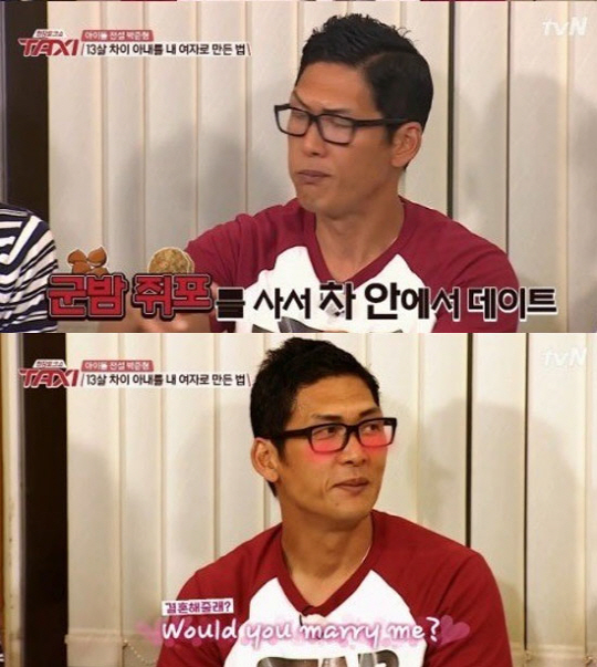 첫 데이트와 똑같은 코스로 군밤을 사서 차안에서 먹으면서 '나랑 결혼 해줄래?'라고 했다는 박준형은 쑥스러운 듯 얼굴을 붉혔다.