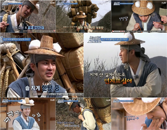 고주원은 세금 50푼을 내기 위해 유상무와 함께 30리(12km) 길을 나섰다. 지게 10kg-바구니 10kg, 총20kg을 지고 산길에 오른 고주원은 땅만 보고 걸으며 고개를 들지 못한 것. 고주원은 한숨이 절로 나오는 30리 보부상의 길에 한탄을 하면서 '주원아씨' 모드를 발동시켰고, 연신 '아씨(아이~씨)'를 외치며 영혼이 너덜너덜 해지는 과정을 보여줘 웃음을 유발했다.