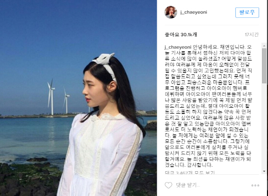 파장이 커지자 정채연은 직접 자신의 인스타그램에 팬들을 다독이는 글을 올렸다. 그는 "절대 아이오아이 활동도 소홀히 하지 않겠다는 약속 꼭 먼저 드리고 싶었어요. 여러분께 많은 사랑 받은 것 잘 알고 있는만큼 아이오아이 멤버로서도 더 노력하는 채연이가 되겠습니다"라며 "늘 저에게는 여러분 앞에 설 수 있는 모든 순간 순간이 소중합니다. 그렇기에 앞으로도 여러분에게 상처를 주거나 실망시켜 드리지 않기 위해 모든 노력을 다할거예요"라고 전하며 사태는 진화됐다.