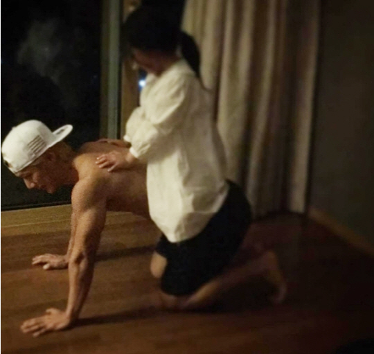 이때 모자를 거꾸로 쓰고 상의를 탈의한 채 울퉁불퉁한 팔 근육을 선보이고 있는 이재진의 모습이 시선이 집중됐다.