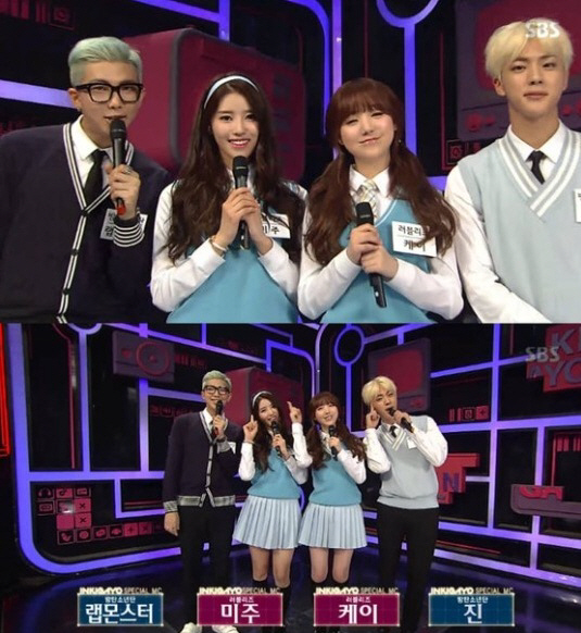 15일 방송된 SBS '생방송 인기가요'에서 방탄소년단의 랩몬스터와 진, 러블리즈의 미주와 케이가 MC로 나섰다.