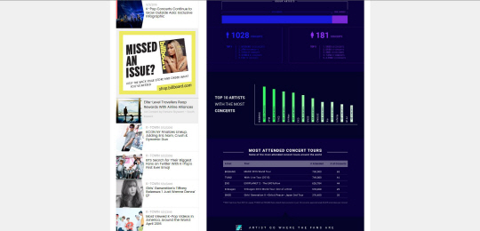 미국 빌보드는 최근 'K-POP 공연이 아시아를 넘어 성장하고 있다'는 제목의 기사를 게재했다. 이들은 또 K-POP 공연 개최 횟수, 아티스트별 공연 횟수, 동원 관객수 등을 심층 분석했다. 그 결과 K-POP 공연을 가장 많이 개최, 최다 관객을 동원한 아티스트는 빅뱅으로 밝혀졌다.