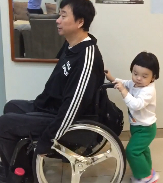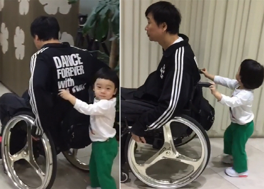 세 살배기 아들은 고사리 손으로 아빠의 휠체어를 조심조심 밀고 있는 모습. 많은 사람들이 오가는 낯선 환경에 두리번 두리번 목을 돌려보기도 하지만, 아빠의 출근길에 여린 힘을 보태고 있는 모습이 보는 이의 엄마미소를 유발한다.