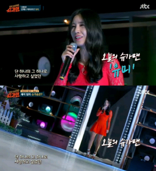 이어 두번째 슈가맨으로 가수 유미가 등장해 환호를 받았다. 유미는 애절한 목소리로 '사랑은 언제나 목마르다' 열창해 감동을 안겼다.