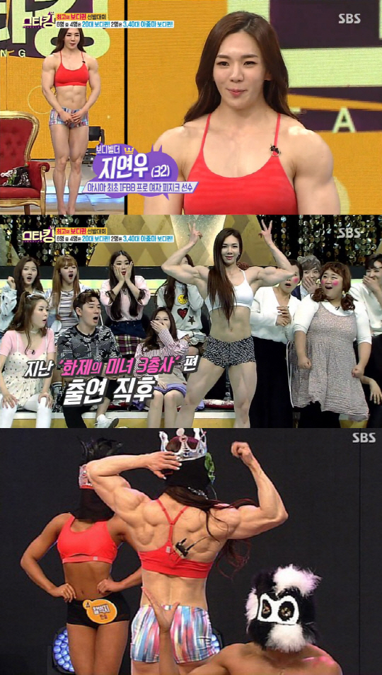 [스포츠조선닷컴 박아람 기자]'머슬퀸' 지연우가 18일 온종일 실시간 검색어 순위권을 장악했다. 지연우는 지난 17일 방송된 SBS '스타킹'의 '최고의 보디퀸 선발대회' 특집에 출연해 남성보다 더 완벽한 등 근육을 자랑했다. 청순하고 귀여운 외모와 확연하게 다른 '반전' 근육질 몸매로 시청자들을 놀라게 했다.
