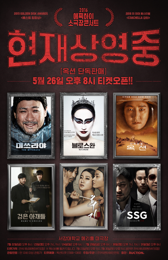 또 '현재상영중'의 콘서트 포스터는 파격적인 공연 형식만큼 신선한 기획으로 화제를 모았는데, 이번에는 더욱 업그레이드 된 이미지로 눈길을 사로잡고 있다. '전기 영화'의 테마를 담은 '미쓰라야'를 시작으로 '스포츠-블로스완', '생존 드라마-옥션', '호러-검은 아재들', '사극후기', '느와르-SSG' 등 이번에도 여장도 마다하지 않는 다양한 모습으로 연출한 에픽하이 멤버들의 콘서트 포스터는 공연에 대한 기대감을 더욱 높이고 있다.