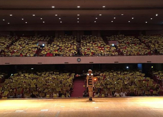 공개된 사진 속에는 노란색 응원 도구를 들고 환호하는 팬들이 꽉찬 객석을 배경으로 함께 단체 사진을 찍은 강성훈의 모습이 담겨있다.