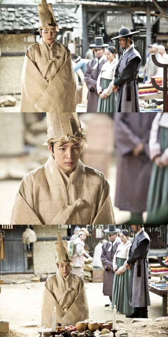 공개된 사진 속에는 상복을 입은 대길의 모습이 담겨 있다. 대길은 삼베로 된 상복을 차려 입은 채 포목점 마당에 무릎 꿇고 앉아 있다. 그의 앞에는 과일과 음식 등으로 채워진 조촐한 제사상이 놓여 있다. 불타오르는 촛불만큼이나, 제사상을 앞에 둔 대길의 눈빛 역시 복잡한 감정으로 불타오르고 있어 눈길을 끈다.