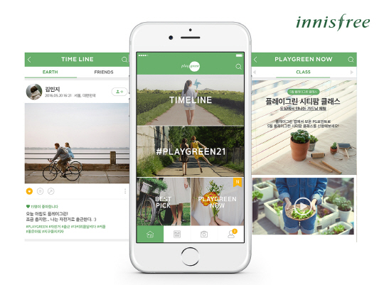 이니스프리의 모바일 앱 플레이그린은 20일부터 애플 앱스토어나 구글 플레이에서 다운로드 할 수 있다.