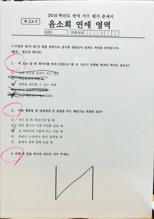 제 2교시는 윤소희의 연애 취향에 관한 문제들로 구성됐습니다. 1번 비오는 날 데이트 할 때 최적의 장소를 고르라는 문제, 윤소희는 3번인 창 밖을 내다볼 수 있는 카페를 골랐습니다. 나머지 보기들은 얼마나 싫은지 직접 선을 그어주기까지 했어요. 5번 그냥 편안하게 집이라는 보기에 대해서 그는 "첫 데이트인데 어떻게 집에…?"라며 얼굴을 붉히기도 했고 미술관이나 박물관은 데이트는 너무 지겨울 것 같으므로 패스, 안개 자욱한 강변 역시 우울하고 심심할 것 같대요. 활기차고 싱그러운 매력의 그녀 다운 답변입니다.