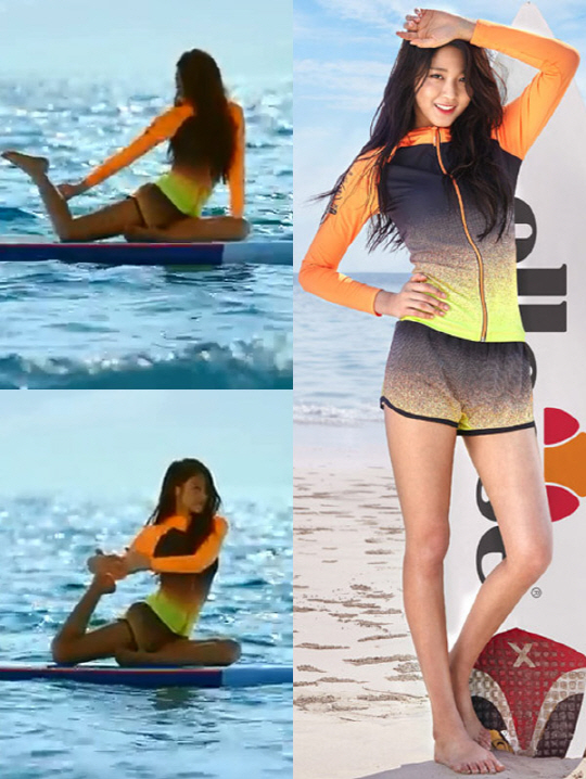 스포츠 브랜드 '엘레쎄'는 지난 1일 공식 유튜브를 통해 푸른 바다를 배경으로 오렌지색 래시가드를 착용한 설현의 영상을 공개했다. 영상 속 설현은 '후드 풀-집 래쉬가드'를 착용하고 서프보드에서 요가를 하고 있다. 길쭉한 팔과 다리를 이용, 유연하게 요가 동작을 소화, 건강미를 과시했다. 또 설현의 검게 그을린 구릿빛 피부와 그러데이션 프린팅이 된 오렌지 색 래시가드는 묘한 매력을 발산, 이국적인 미모를 빛나게 했다. 과한 노출 없이도 S라인의 아름다움을 유감없이 드러낸 그녀는 걸그룹 최고의 건강 미인.