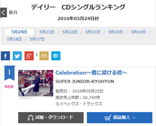 [스포츠조선닷컴 이지현 기자] SM 대표 감성 발라더 슈퍼주니어 규현이 일본 오리콘 데일리 싱글 차트 1위에 올랐다.