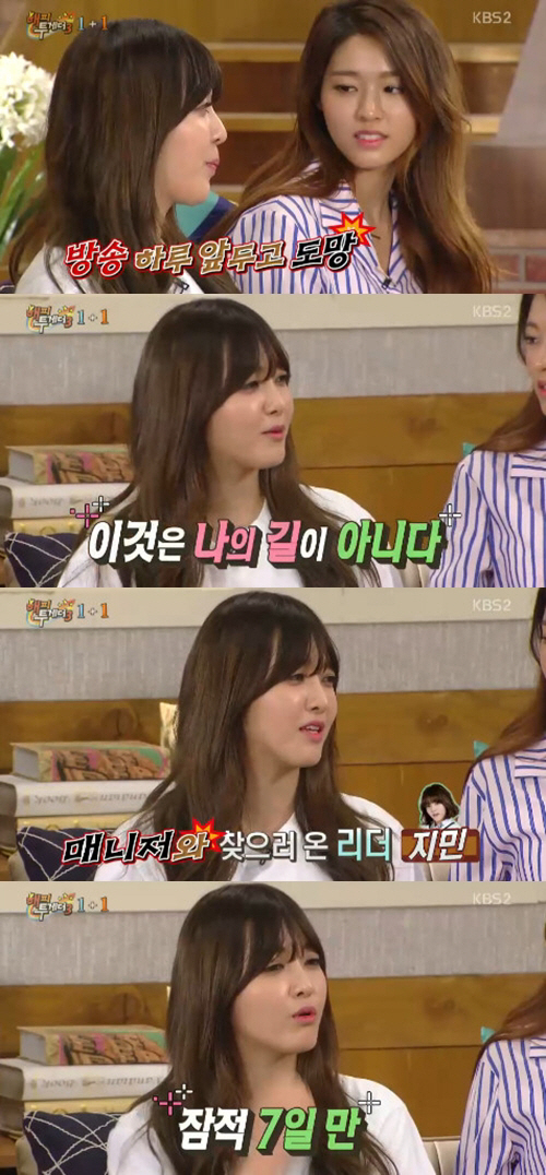 이어 "집으로 가야겠다고 생각해서 가출했다. 지민언니가 매니저랑 찾으러 온 걸 보고 놀라서 도망갔다. 근데 바깥세상도 무서웠다. 찜질방 가서 숙식하고 한강가서 울었다"고 덧붙였다.